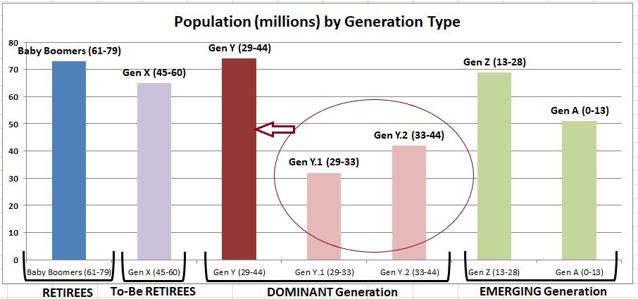 - Gen Y.1 = 29-33 years old (around 32 million people in the U.S.)